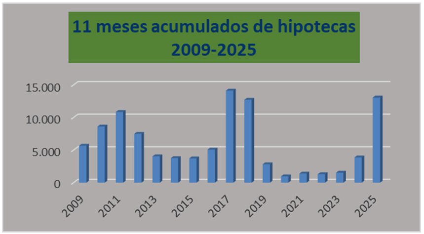 En octubre, hubo 737 escrituras formalizadas con hipoteca. Por lo que la baja en ese sentido es del 22,4% respecto al mismo mes del año pasado. En los primeros 11 meses se contabilizan 13.065 (+238%).