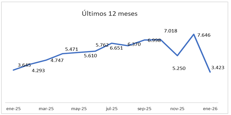 En comparación con diciembre de 2025, los actos descendieron un 55,2% (dic 7646 escrituras).